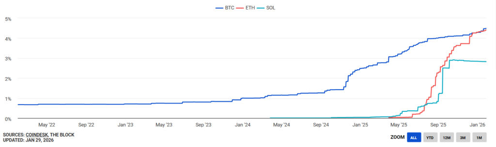 At the same time, lower borrowing costs through mid-2025 improved the economics of debt-funded accumulation. The combination of regulatory clarity, favourable financing conditions, and maturing operational infrastructure laid the groundwork for the institutional-grade treasury strategies now visible in early 2026.