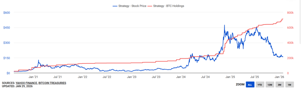 As of 29th Jan 2026, Strategy holds 712,647 BTC, at an aggregate cost basis of about $54.19 billion (approximately $76,040 per BTC), representing around 3% of Bitcoin’s total supply and well over half of all BTC held by public companies. At the time of writing, Strategy’s BTC position is valued above $62.5 billion.