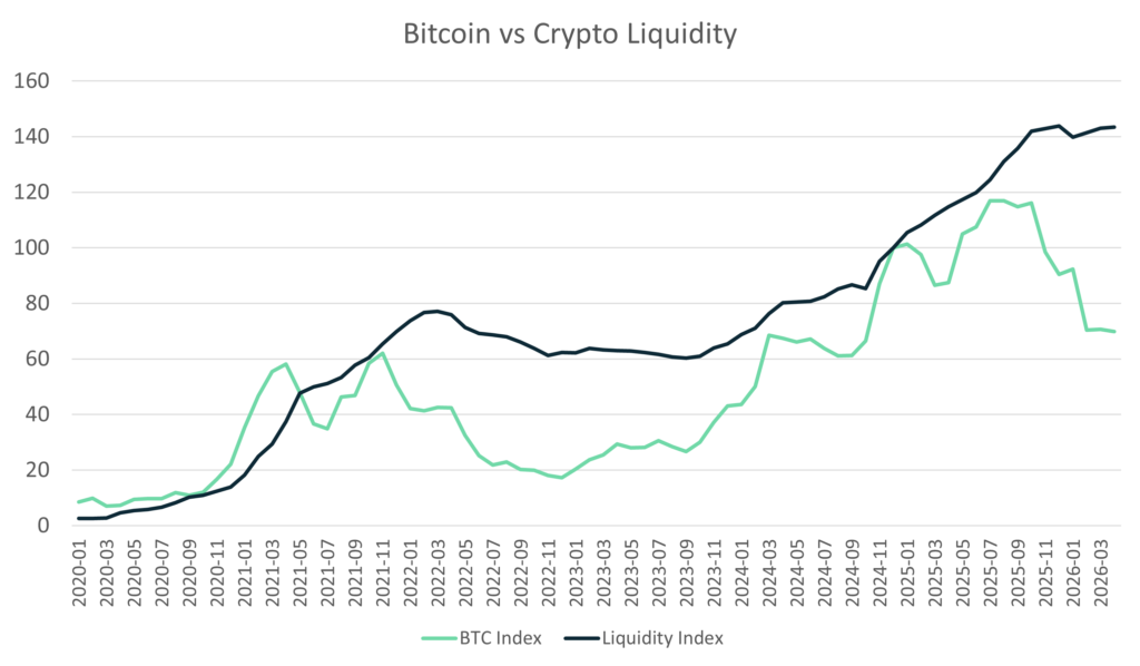 Figure 1: Bitcoin vs Crypto Liquidity (Indexed to 100, 2020–2026)