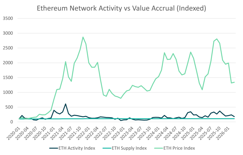 Figure 2: Ethereum Activity vs Supply (Indexed to 100, 2020–2026)