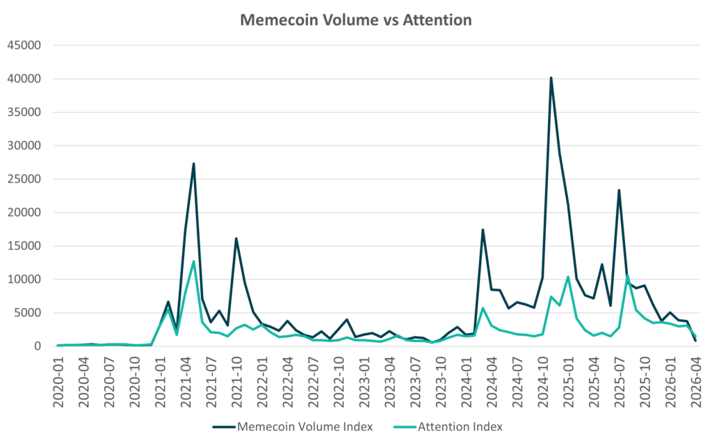 Figure 3: Memecoin Volume vs Attention (Indexed to 100, 2020–2026)