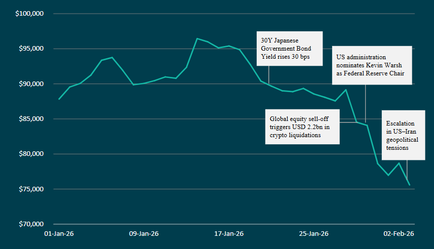 Figure 2: Bitcoin Price Decline Driven by Global Macro Events (Jan–Feb 2026)