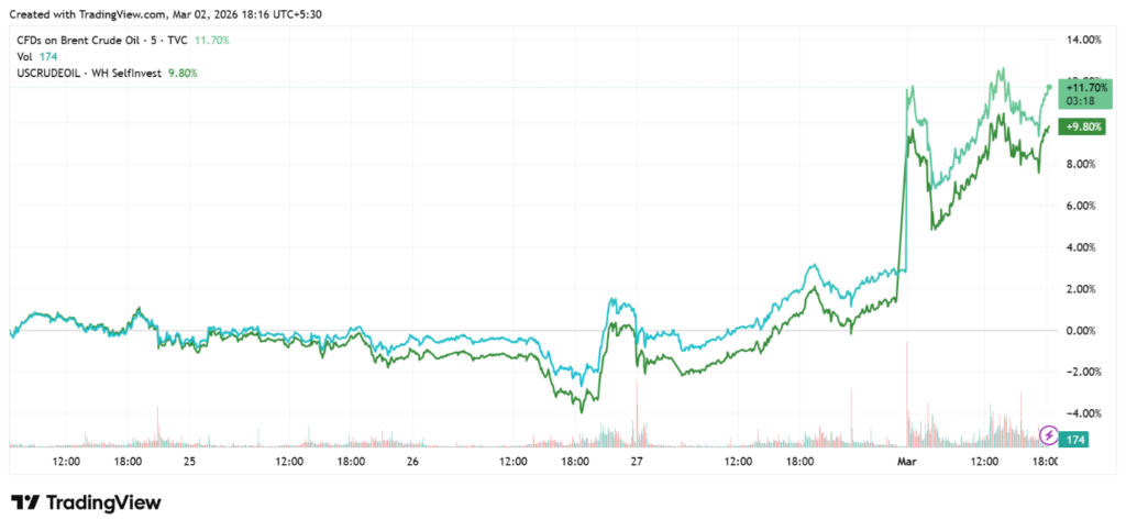 Oil markets responded first. Brent crude surged more than 13 percent in early trading, briefly touching 82 dollars per barrel after settling near 73 dollars on Friday. U.S. West Texas Intermediate rose toward 72 dollars, marking a double-digit percentage gain within hours.