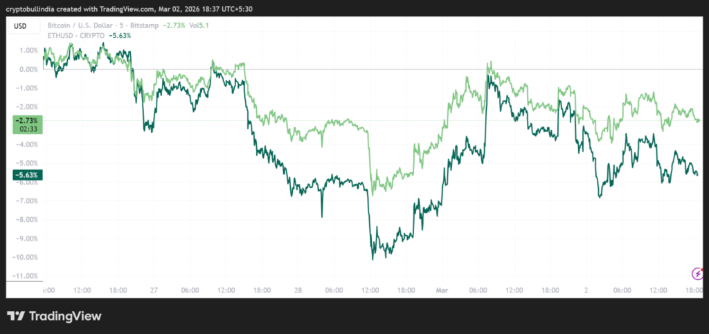 Crypto markets, which operate continuously, provided an early signal of investor psychology. Bitcoin declined from the high 60,000 dollar range toward 63,000 before stabilising near 66,000. Ether fell approximately 5 to 6 percent toward 1,800 dollars. Roughly 128 billion dollars was erased from aggregate crypto market capitalisation during the initial move.