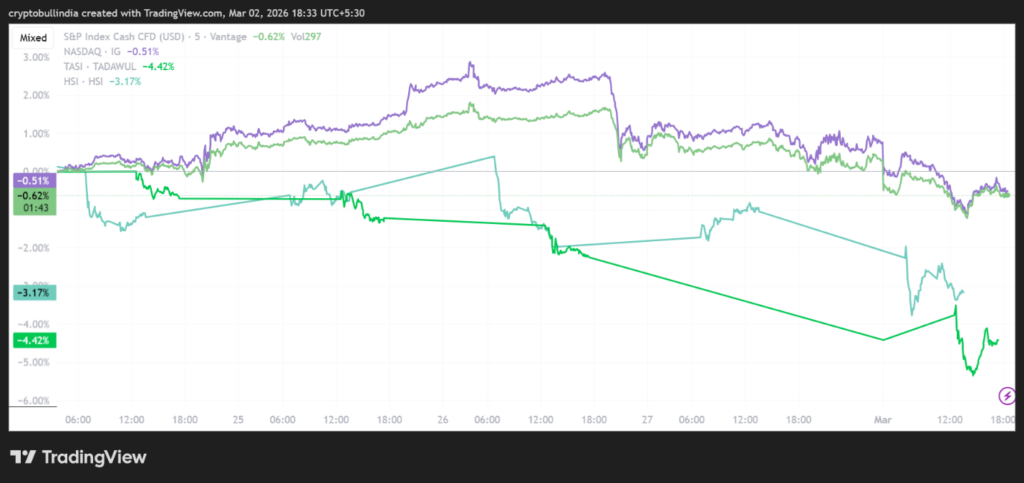 Asian markets fell between 1.6 and 2.5 percent, while Gulf markets declined more sharply as regional risk became immediate. Saudi Arabia’s TASI index dropped over 4 percent following reports of strikes near Riyadh.