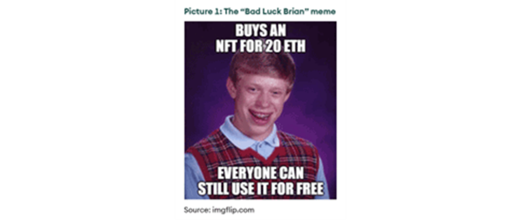For a piece of digital art, the NFT is not the jpeg file; it is the ownership title to the art. Some of the subjects in popular memes like Bad Luck Brian, Overly Attached Girlfriend or Scumbag Steve sold the original photo of the meme as NFTs for 20, 200 and ~30 ETH, respectively. In this case, it is obvious that since everyone can use the picture to make the meme, the NFT is not the picture nor the exclusive right to use it. The buyer has bought a collectible item that is verifiably limited and authenticated by the person in the meme picture itself.